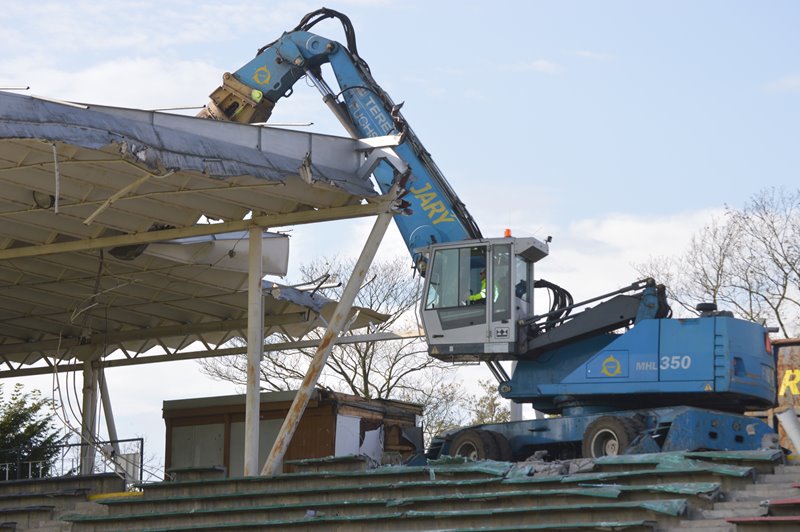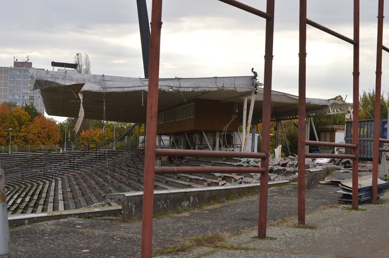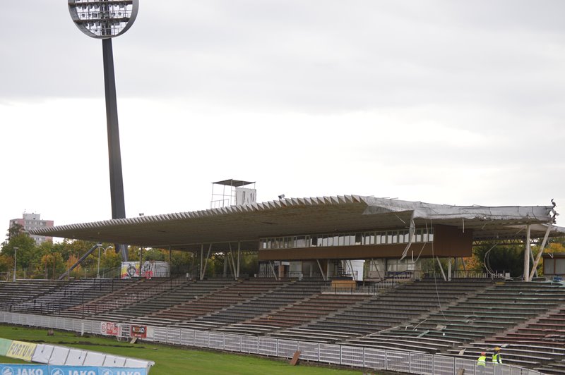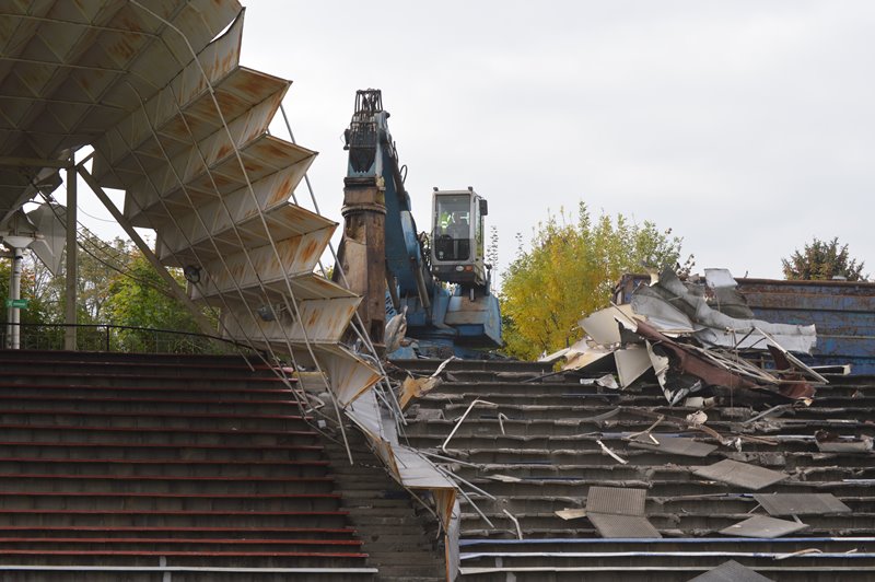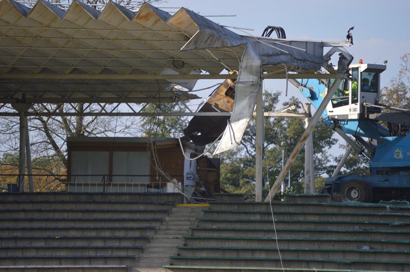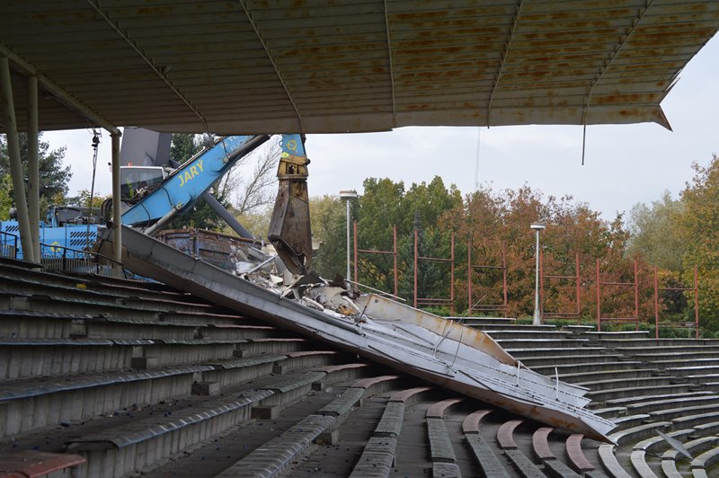 Již není žádný pochyb o tom, že všesportovní stadion, který vznikl před více než 50 lety, se v nejbližší době nenávratně změní v novou arénu. O víkendu zmizela ze západní části většina sedaček, v týdnu se pak speciální hydraulické nůžky osmatřicetitunového stroje zakously také do střechy západní tribuny Malšovického stadionu. Za několik dní se dělníci pustí do demontáže kiosků. Do zimy by pak mělo zmizet vše betonové.Postup demoličních prací stavbaři přizpůsobí programu domácích zápasů Votroků. Pokud vše půjde podle plánu, celá tribuna bude pryč do konce tohoto roku. Do konce příštího týdne zmizí vše železné, za dalších dvacet dní vše betonové. Bourání budou zatím ušetřeny jen osvětlovací stožáry. „Lízátka budou demontována až v příštím roce a nahradíme je novými, ale nižšími i úspornějšími,“ uvedl člen představenstva a náměstek primátora Jindřich Vedlich. S tím souvisí i zachování valu na západní straně, který slouží právě k ukotvení ikonických světelných stožárů.